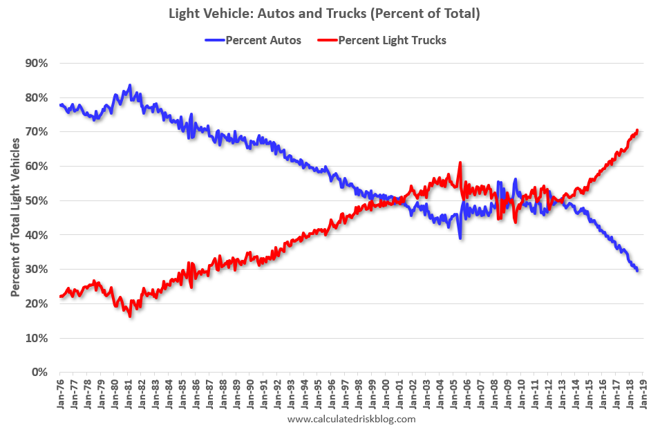 Currently this ratio is at 23.9 years, the highest ever. This is an unsustainable level (I doubt most vehicles will last 24 years!), and the ratio will probably decline over the next few years. This could happen with vehicles being removed from the fleet, but more likely because of a sales increase.