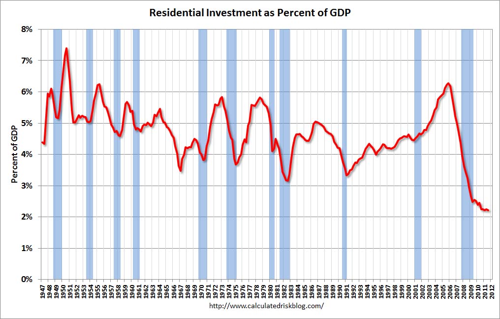 Residential Investment (RI) made a positive contribution to GDP in Q3 2011, and the four quarter rolling average finally turned positive in Q3.