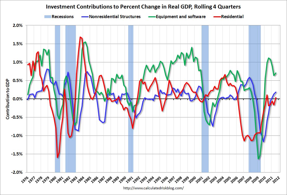 The following graph shows the rolling 4 quarter contribution to GDP from residential investment, equipment and software, and nonresidential structures. This is important to follow because residential investment tends to lead the economy, equipment and software is generally coincident, and nonresidential structure investment trails the economy.