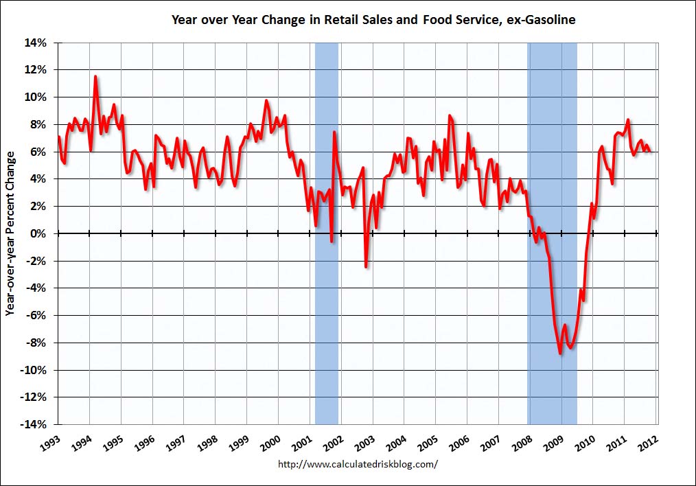 On a monthly basis, retail sales were up 0.5% from September to October (seasonally adjusted, after revisions), and sales were up 7.9% from October 2010. From the Census Bureau report: