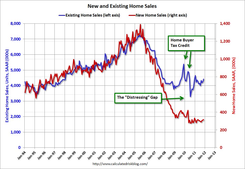 Following the housing bubble and bust, the "distressing gap" appeared mostly because of distressed sales. The flood of distressed sales has kept existing home sales elevated, and depressed new home sales since builders can't compete with the low prices of all the foreclosed properties.