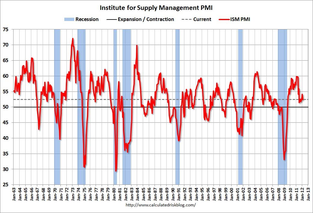 10:00 AM ET: ISM Manufacturing Index for March. Here is a long term graph of the ISM manufacturing index. The consensus is for a slight increase to 53.0 from 52.4 in February.