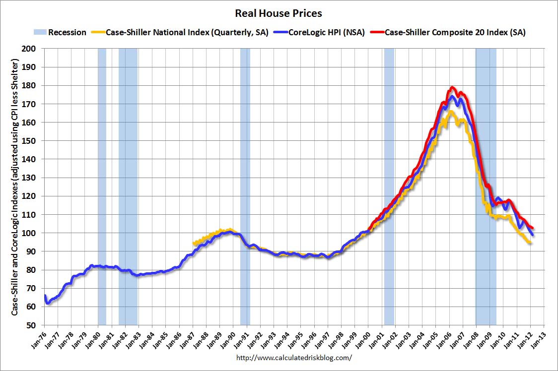 In nominal terms, the Case-Shiller National index (SA) is back to Q3 2002 levels, the Case-Shiller Composite 20 Index (SA) is back to January 2003 levels, and the CoreLogic index (NSA) is back to January 2003.