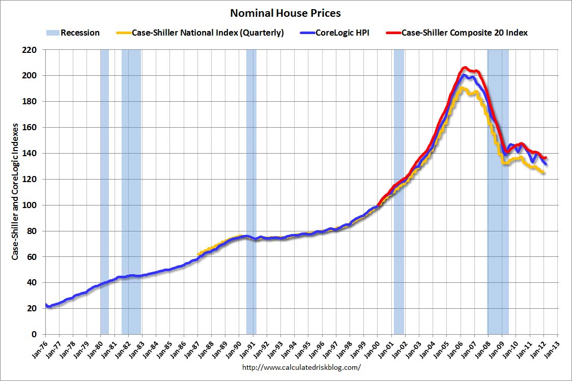 The first graph shows the quarterly Case-Shiller National Index SA (through Q4 2011), and the monthly Case-Shiller Composite 20 SA and CoreLogic House Price Indexes (through February) in nominal terms as reported.