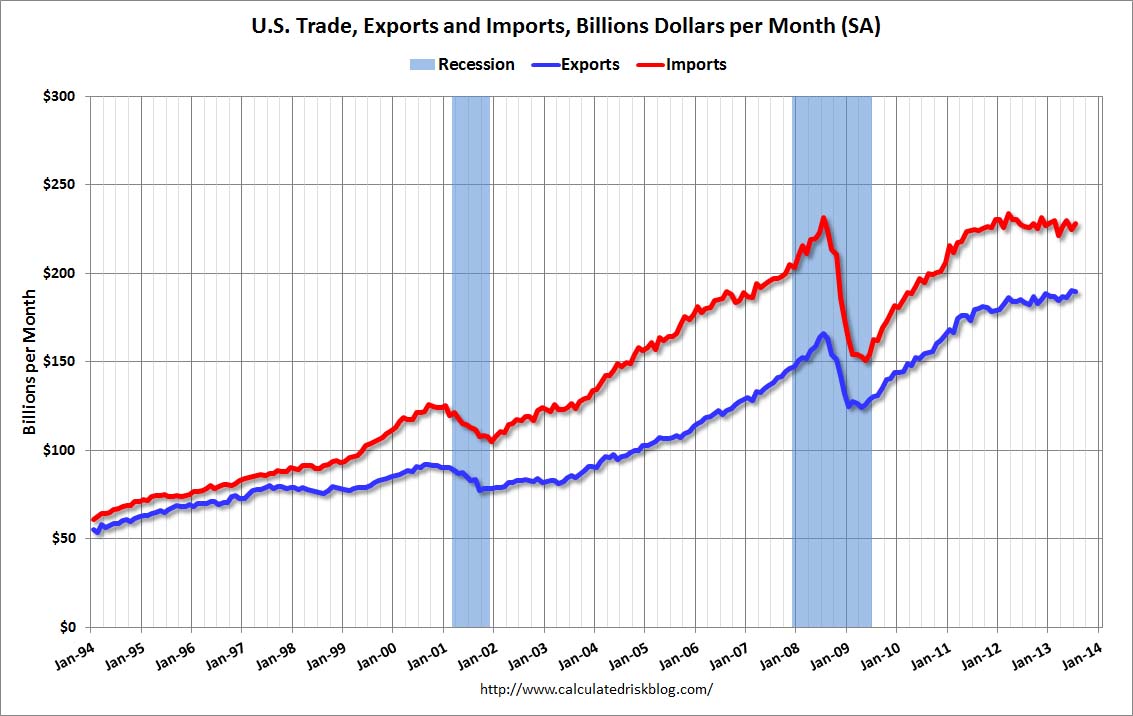 The first graph shows the monthly U.S. exports and imports in dollars through July 2013.