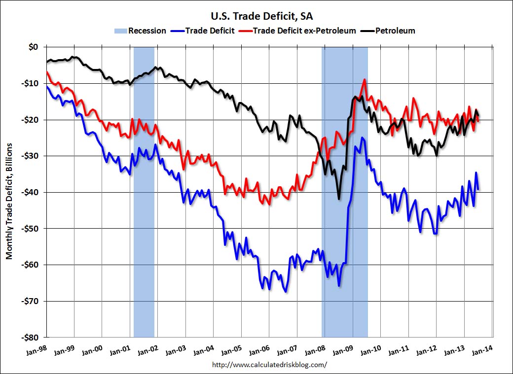 The blue line is the total deficit, and the black line is the petroleum deficit, and the red line is the trade deficit ex-petroleum products.Oil averaged $97.07 in July, up slightly from $96.93 in June, and up from $93.71 in July 2012.