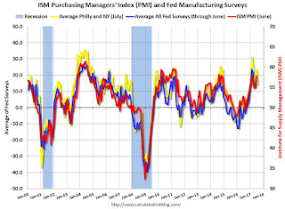 The New York and Philly Fed surveys are averaged together (yellow, through July), and five Fed surveys are averaged (blue, through June) including New York, Philly, Richmond, Dallas and Kansas City. The Institute for Supply Management (ISM) PMI (red) is through June (right axis).