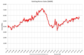 This graph shows existing home sales, on a Seasonally Adjusted Annual Rate (SAAR) basis since 1993.