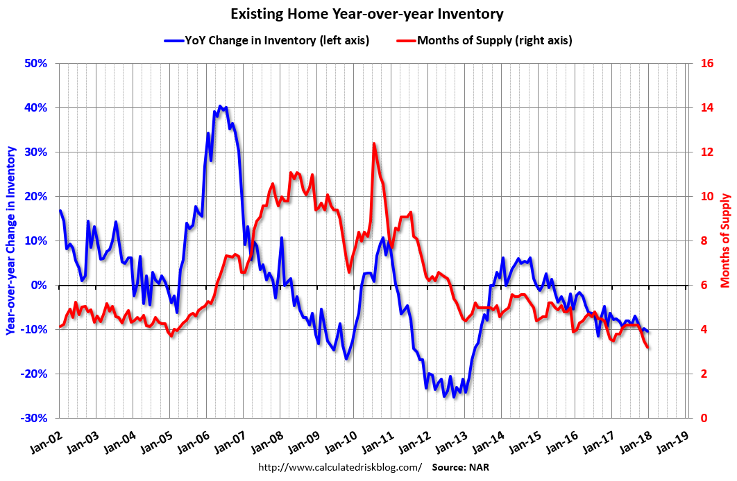 The last graph shows the year-over-year (YoY) change in reported existing home inventory and months-of-supply. Since inventory is not seasonally adjusted, it really helps to look at the YoY change. Note: Months-of-supply is based on the seasonally adjusted sales and not seasonally adjusted inventory.