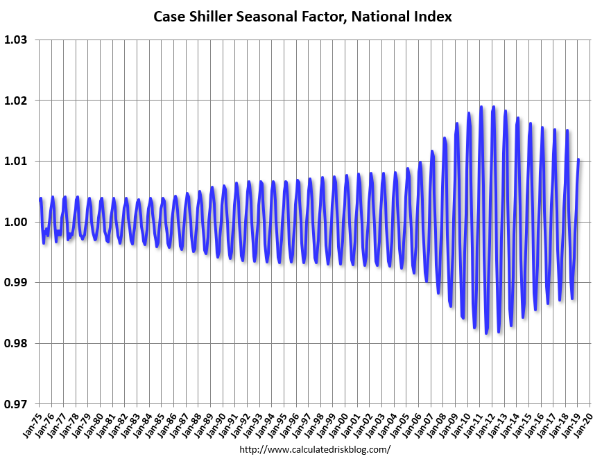 This graph shows the month-to-month change in the NSA Case-Shiller National index since 1987 (through January 2019). The seasonal pattern was smaller back in the '90s and early '00s, and increased once the bubble burst.