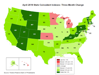 The Federal Reserve Bank of Philadelphia has released the coincident indexes for the 50 states for April 2019. Over the past three months, the indexes increased in 46 states and decreased in four, for a three-month diffusion index of 84. In the past month, the indexes increased in 44 states, decreased in four states, and remained stable in two, for a one-month diffusion index of 80.Note: These are coincident indexes constructed from state employment data. An explanation from the Philly Fed: