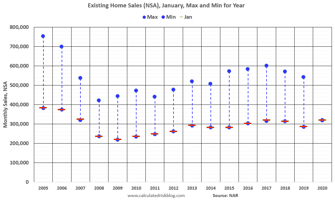 The second graph shows existing home sales Not Seasonally Adjusted (NSA) in January (Red dashes), and the minimum and maximum for each year.