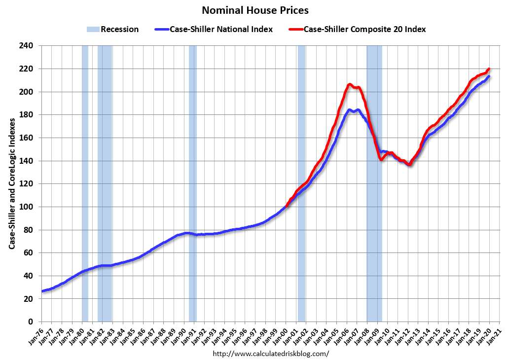 In nominal terms, the Case-Shiller National index (SA)and the Case-Shiller Composite 20 Index (SA) are both at new all times highs (above the bubble peak).