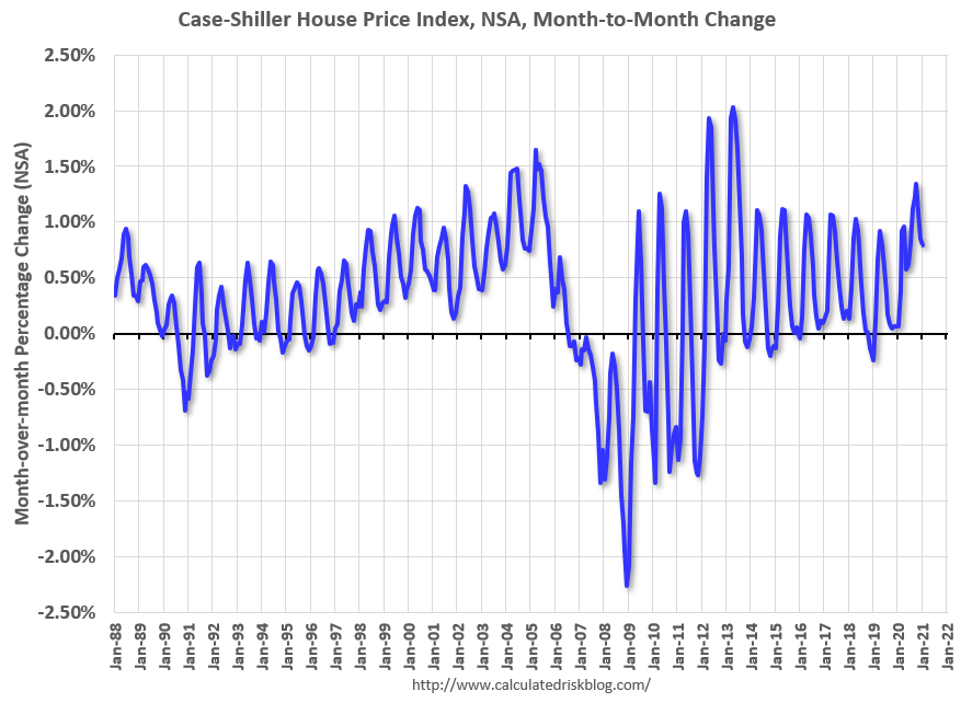 This graph shows the month-to-month change in the NSA Case-Shiller National index since 1987 (through January 2021). The seasonal pattern was smaller back in the '90s and early '00s, and increased once the bubble burst.