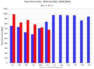 The inventory of completed homes for sale was at 36 thousand in June, just above the record low of 33 thousand in March and April 2021. That is about 0.6 months of completed supply (just above the record low).