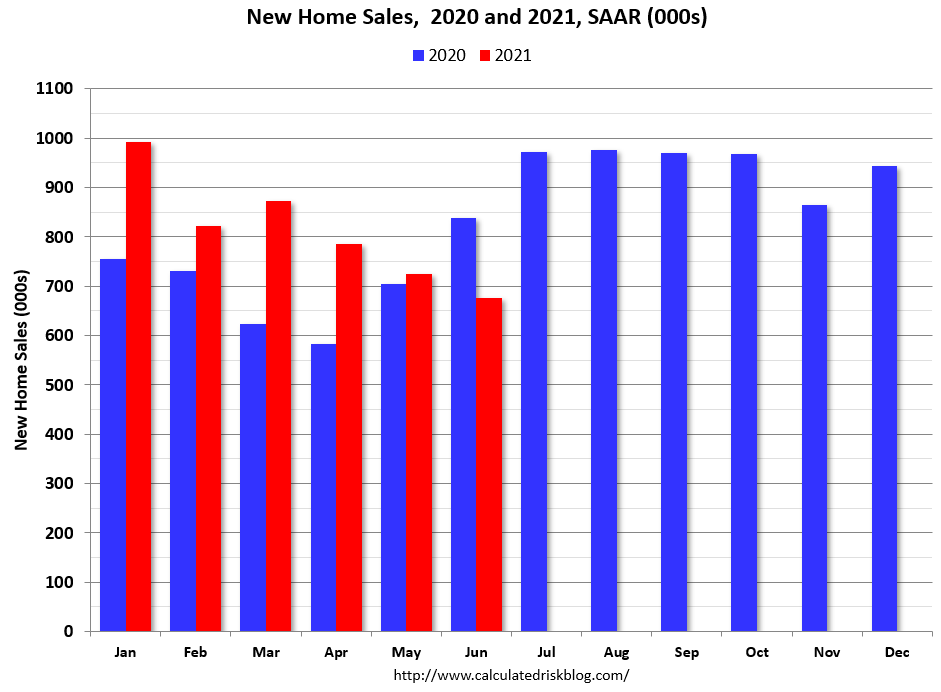 New home sales for June were reported at 676,000 on a seasonally adjusted annual rate basis (SAAR). Sales for the previous three months were revised down significantly.