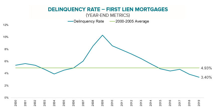 • When the rate of improvement slowed in mid-2019, it appeared the market was approaching a trough in mortgage delinquencies