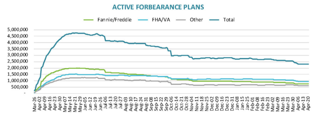Despite the week’s modest improvement, the number of outstanding plans is down by 298,000 (-11.4%) from the same time last month. As of April 20, there are 2.3 million (4.4% of) mortgage-holders in COVID-19-related forbearance plans, including 2.7% of GSE, 7.8% of FHA/VA and 4.8% of portfolio/PLS loans.